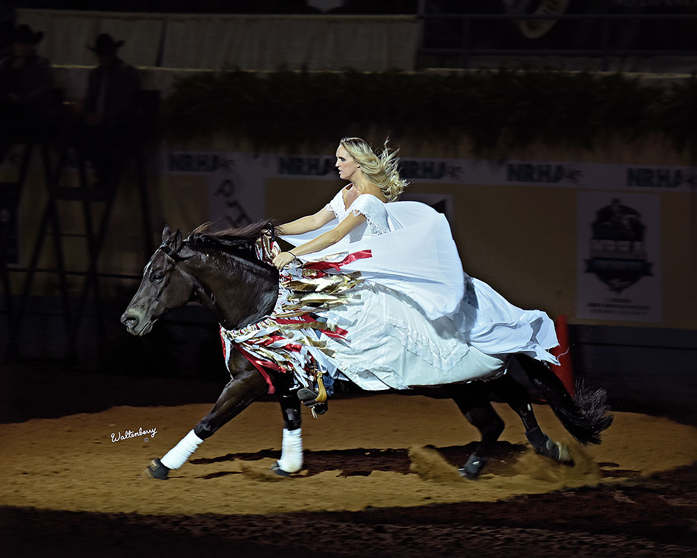 Freestyle reining has been popular at the NRHA Futurity in the past but was moved to the Derby in 2022 to give it a more prominent position. Often compared to figure skating routines, Freestyle Reining pairs the athleticism and finesse of reining moves choreographed to music, often with clever costuming and props.