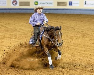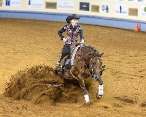 North Sail Solitaire, by NRHA Twelve Million Dollar Sire Topsail Whiz out of Solitary Gunner, is special to Whitmarsh’s family. “He is the first baby we raised on our farm. He was started down here by Casey Deary, and then we brought him home after a minor injury. Then Austin, my coach up north, has been showing him and riding him through his derby years, and has done phenomenal with him,” she explained. “I just got to start riding him a couple years ago, and we are finally starting to work more as a team and our styles are starting to mend.”