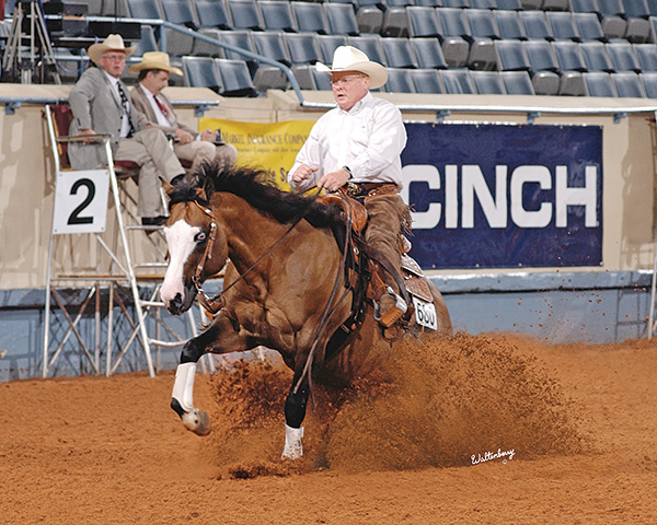 ​Even in retirement, Jerry found success. What began as a harmless hobby turned into Jerry’s second calling. Carmen had always been a horse enthusiast and their daughters also enjoyed horses. Not long after his retirement years began, Jerry immersed himself into the horse world of western pleasure, with much thanks to friend and horseman Cleve Wells. Jerry started from scratch and was proud to admit that he was learning new things every day, even into his seventies. He brought this positive attitude into the arena and treated his time as a horseman less as a business than as a sense of pure enjoyment. He once stated, “I retired totally from business. For me, horses are just fun.” Anyone who ever saw Jerry in the saddle could easily witness the man’s love for horses. After making his mark in the western pleasure pen, Jerry poured his heart, soul, and wallet into the reining world.