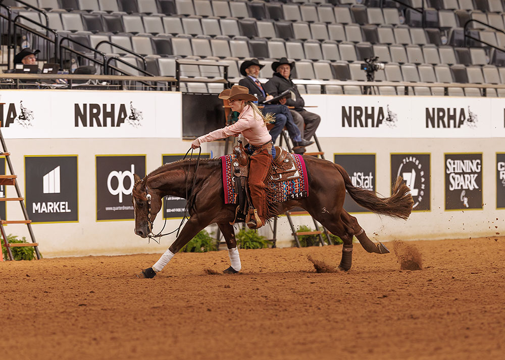 The National Reining Horse Association is proud to announce that Kaci J. O’Rourke of Cross Roads, Texas, has officially become the association’s newest Million Dollar Rider. O’Rourke reached this career milestone following her performance at the 2025 NRHA Futurity®. O’Rourke rode A Black Tie Affaire (A Vintage Smoke x Shesouttayourleague) owned by 13Moonstruck, and nominated by breeder Brooke Wharton and Gunnabegreatagain (Gunnatrashya x Jills Remedy) owned by Peter and Courtney Morgan and nominated by breeder Samantha Tully, in the Open Finals for a total check of $50,000 – pushing her lifetime earnings to over $1 million and signing her ticket to an elite group of NRHA Professionals.