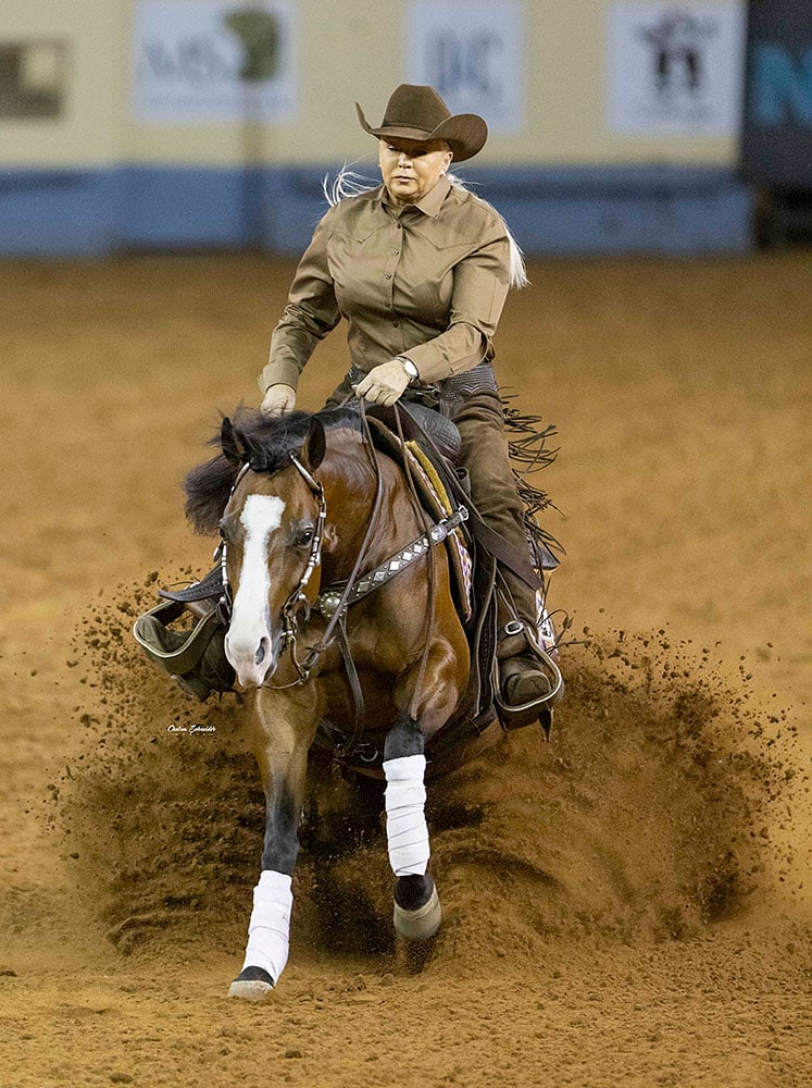 Kelle was fierce in everything she did, and that tenacity helped her win countless titles, including two NRHA Futurity Non Pro Championships. On Sunday, she competed on her horse, See Ya Seven, and advanced to yet another NRHA Futurity Finals.