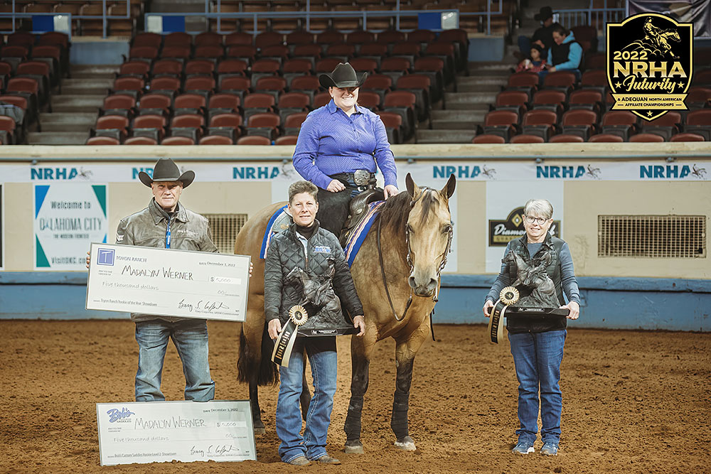 An exciting week at the 2022 National Reining Horse Association Futurity and Adequan® North American Affiliate Championships wrapped up on a high note. Two young riders split the Championship of the Youth 14 – 18 NAAC, and in the Coliseum Arena, Madalyn Werner, who finished second in the Toyon Ranch Rookie of the Year, came for redemption, winning both the Toyon Ranch and Bob’s Custom Saddles Rookie Showdowns.